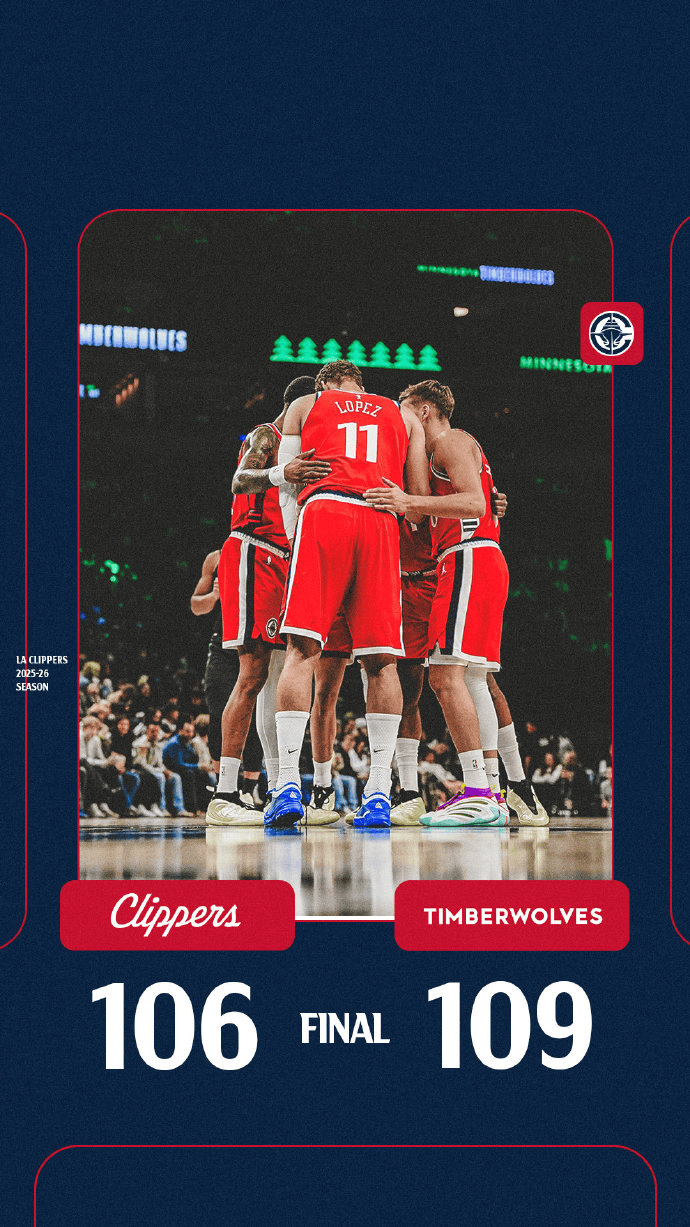 虎撲12月07日訊 今日NBA常規(guī)賽,快船106-109不敵森林狼。到勝