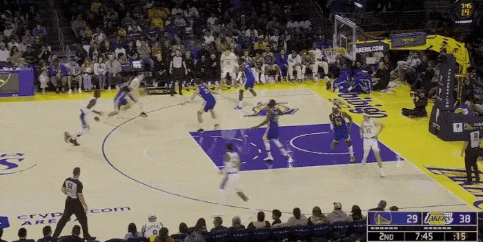 NBA季前賽,湖人對(duì)陣勇士的擋拆比賽正在進(jìn)行中。