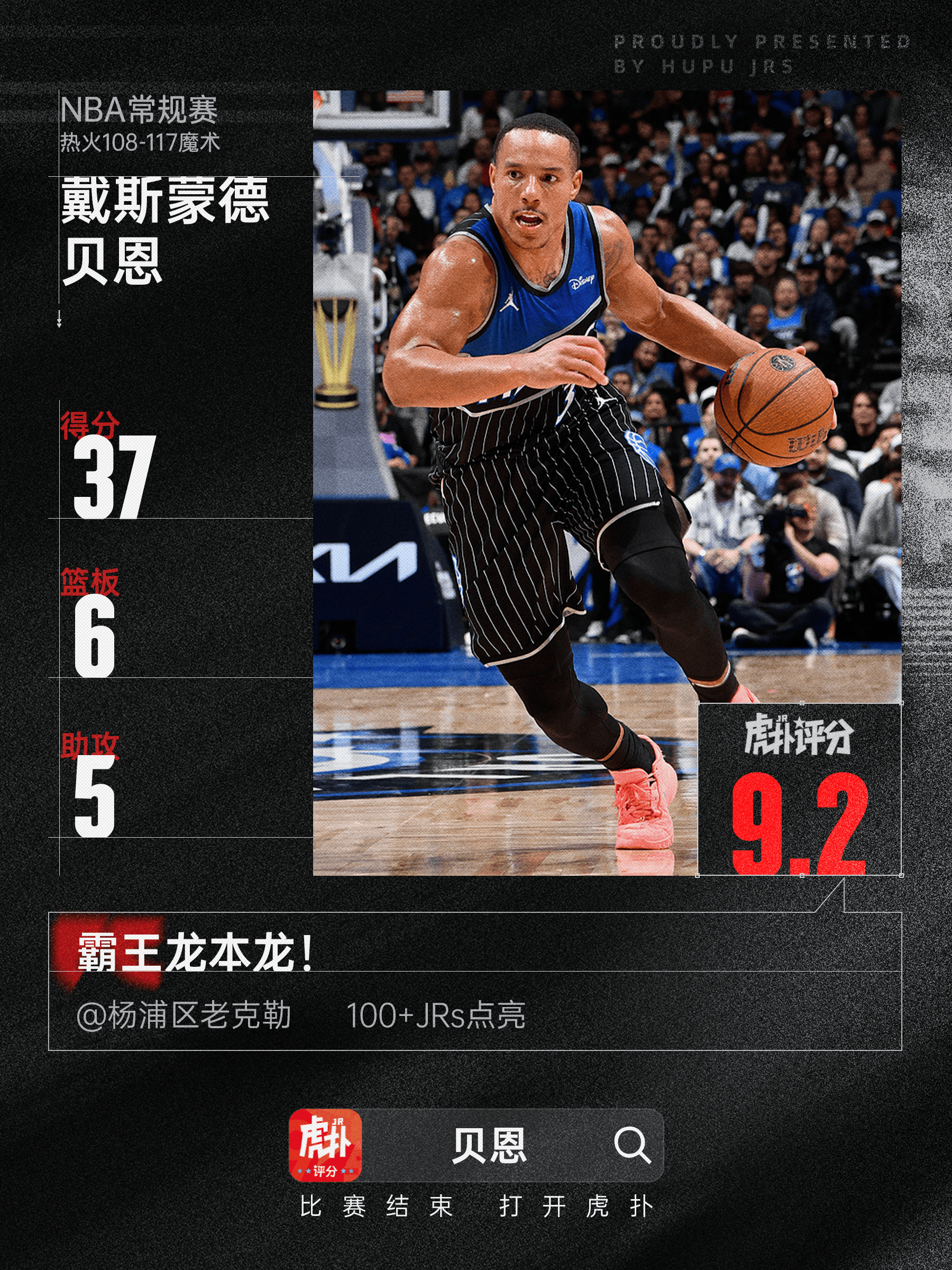 本場(chǎng)比賽,換值魔術(shù)球員戴斯蒙德-貝恩出戰(zhàn)38分鐘,不值貝恩板助24投14中,全場(chǎng)其中三分球9投6中,罰球3投3中,得到37分6籃板5助攻1搶斷。