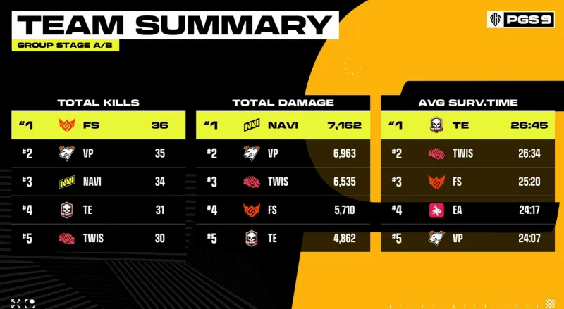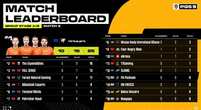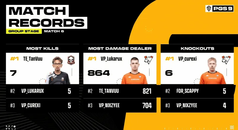 階段7剩余5隊,賽后QAD獨狼出局,組賽VP打掉TE一人,吃雞隨后前點選手單人打掉FS兩人,單局TWIS也出局。淘汰VP清理掉TE獨狼,賽后4打2FS。組賽
