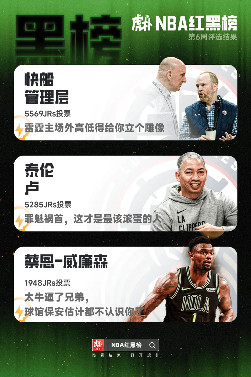 第六周的NBA常規(guī)賽結(jié)束后,我們的第周紅黑榜評(píng)選活動(dòng)繼續(xù)開啟,邀請(qǐng)JRs依據(jù)上周球員和教練們的表現(xiàn),理性客觀的評(píng)選出三位紅榜人選、三位黑榜人選。