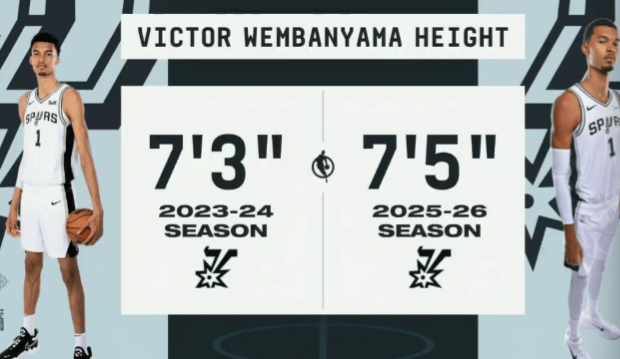 此前,文班亞馬在2023年NBA選秀時被列為7尺3寸(約2.21米),但根據(jù)圣安東尼奧馬刺隊的最新官方數(shù)據(jù),他的身高已更新為7尺5寸(約2.26米)。