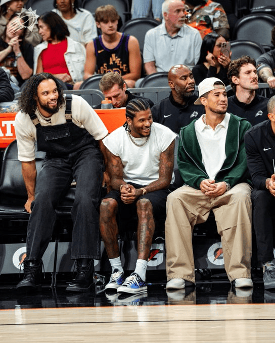 太陽(yáng)官方曬出狄龍、太陽(yáng)杰倫-格林和布克場(chǎng)邊的官方照片與球迷分享,并附文:“場(chǎng)邊支持??!曬狄”