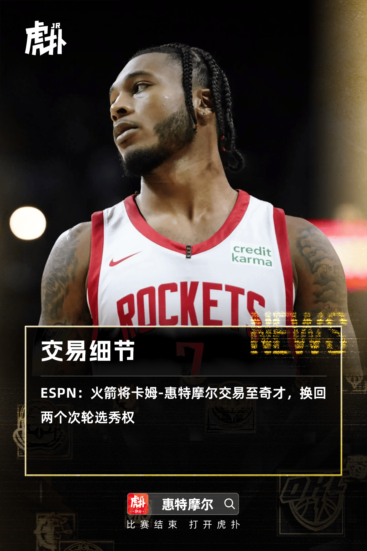 據(jù)ESPN報道,盡管火箭收到了多支球隊關(guān)于卡姆-惠特摩爾的報價,但最終他們選擇將其交易至最有利于其“成長與發(fā)展”的球隊。