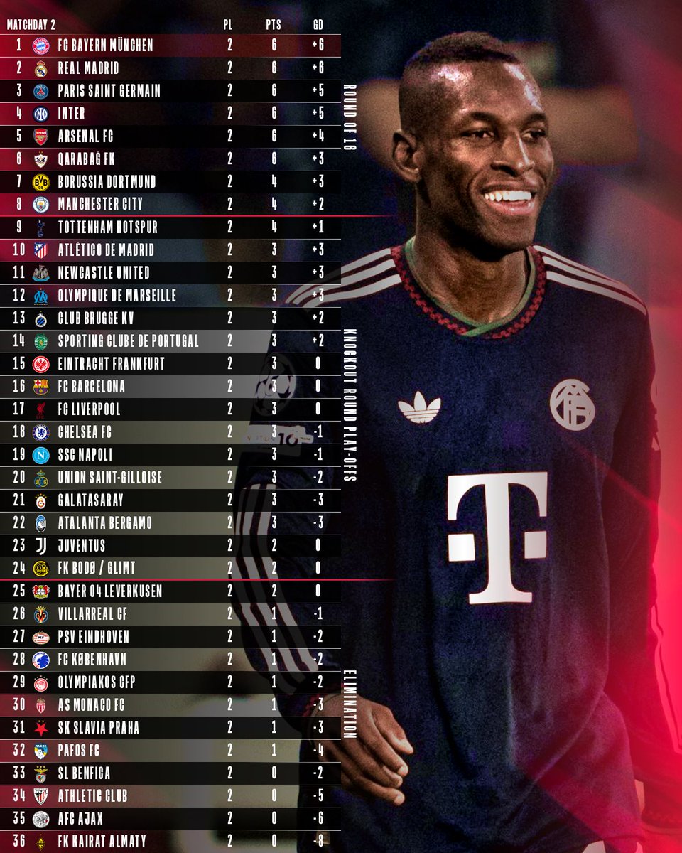 來源:X虎撲10月02日訊 歐冠聯(lián)賽階段第二輪結(jié)束,拜仁慕尼黑官方發(fā)布了目前歐冠聯(lián)賽的歐冠積分榜。