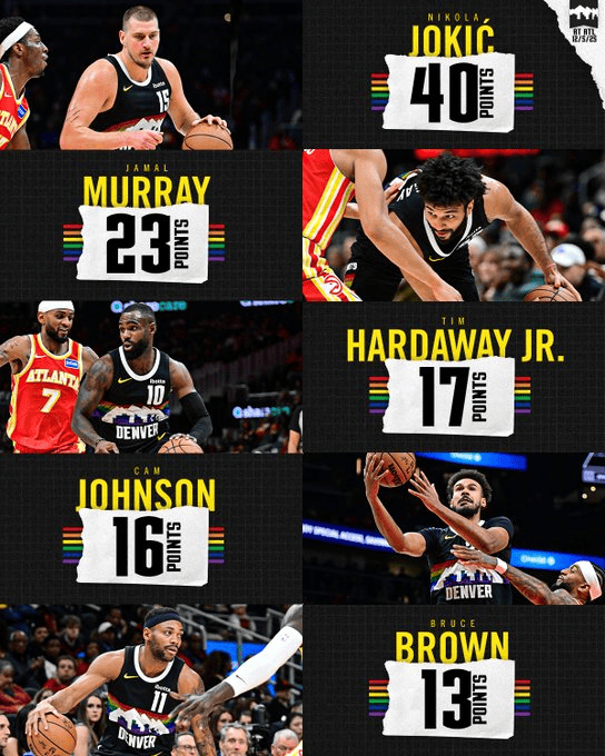 本場比賽,推發(fā)圖并約基奇拿下40分,配文默里拿下23分,引領(lǐng)卡梅倫-約翰遜拿下16分,逆轉(zhuǎn)小蒂姆-哈達威拿下17分,分手布魯斯-布朗拿下12分。板掘