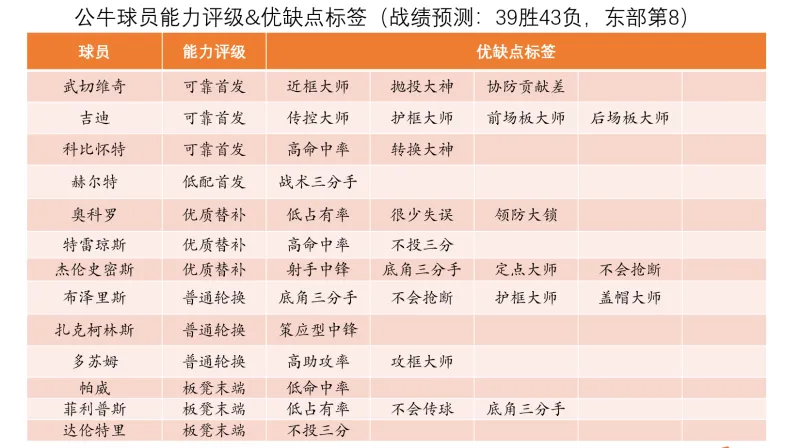 最后是公牛球員的能力評級及優(yōu)缺點標(biāo)簽,這里的優(yōu)缺點基本是超過同位置90%或低于同位置10%才會出現(xiàn)。希望下賽季公牛能打出超預(yù)期的表現(xiàn),為管理層結(jié)束重建、在休賽期搭建一套適合核心板底的陣容注入強心劑,祝年輕的公牛球員們好運~~