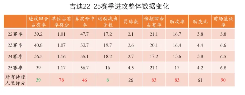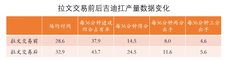 好消息是在拉文交易后,吉迪在扛球權(quán)上的相關(guān)數(shù)據(jù)大幅提升,進(jìn)攻回合占有率終于來到了40%以上,兩分出手從每36分鐘8次大幅提升到11.6次,但三分出手只有1次的微小增長。且這段時間吉迪的手感有些太過逆天,下賽季能否維持住、特別是在對手適應(yīng)了公牛新風(fēng)格后能否維持住是關(guān)鍵。