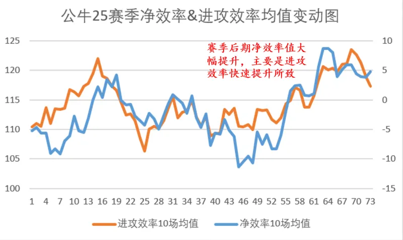 對上賽季的公牛球迷而言,最甜蜜的時光大概率是賽季最后20場的一路狂飆,打出了15勝5負(fù)的出色戰(zhàn)績,其中還包括與湖人一戰(zhàn)的大逆轉(zhuǎn),從上圖來看進(jìn)攻效率的大幅提升是公牛進(jìn)步的主因,到賽季末期甚至把進(jìn)攻效率均值打到了120分的聯(lián)盟第1水準(zhǔn)。不過客觀來說最后20場比賽存在對手整體實力偏弱、遇到的強隊又有核心球員輪休的情形,所以管理層并沒被這一段時間的驚艷表現(xiàn)沖昏頭腦,而是堅持以合理價格與吉迪續(xù)約,繼續(xù)觀察26賽季的球隊表現(xiàn)。