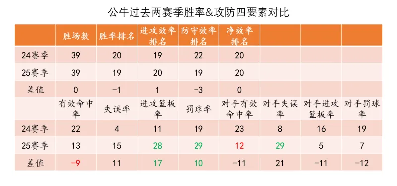 上賽季公牛在接連損失德羅贊、拉文的背景下依然得到了與24賽季完全一樣的39勝,很值得表揚。雖然與24賽季相比,公牛的攻防效率排名幾乎完全一致,但是攻防兩端的策略都有了翻天覆地的變化——從攻防四要素看公牛在進(jìn)攻端有了更好的投籃分布,因此有效命中率大增,但與此同時他們對進(jìn)攻籃板的拼搶和罰球侵略性則大幅下降;而在防守端他們非常強調(diào)“保持在進(jìn)攻球員身前完成干擾”,因此限制命中率、不讓對方罰球、保護(hù)后場籃板等方面均有明顯增長,但是造對手失誤率上斷崖下滑。