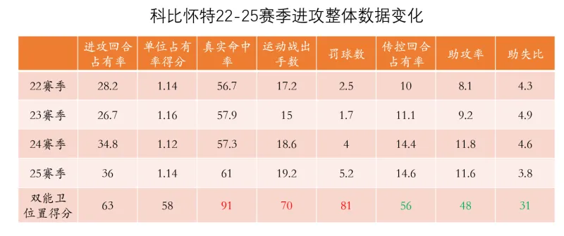 科比懷特25賽季真實命中率上取得大幅提升,但扛球權(quán)的能力上并無明顯增長,主要原因是他的傳控能力放在雙能衛(wèi)位置上都并不突出,特別是上賽季開放進(jìn)攻的環(huán)境下,懷特的助失比還出現(xiàn)了逆勢下滑。不過如果懷特能將高命中率進(jìn)球能力維持住,將創(chuàng)造好機會的工作交給吉迪,兩人的搭檔在進(jìn)攻端會非常互補。