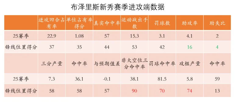 布澤里斯新秀賽季的進(jìn)攻端數(shù)據(jù)比較平庸,特別是在傳控端幾乎毫無貢獻(xiàn)。不過在三分投射上他的表現(xiàn)不錯,特別是抗干擾下的三分命中率非常優(yōu)秀。此外布澤里斯也能頻繁到禁區(qū)攻框但受限于對抗能力不足,攻框命中率極其慘淡。