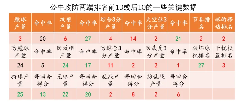 從一些關(guān)鍵數(shù)據(jù)排名上,我們能更進(jìn)一步體會公牛在攻防兩端的變化,進(jìn)攻端公牛選擇堅決提速,有聯(lián)盟第2的節(jié)奏、第2和第8的亂戰(zhàn)產(chǎn)效,得益于大量的快攻機會他們的魔球產(chǎn)量高居聯(lián)盟第二,其中三分產(chǎn)量位居聯(lián)盟第4,這是25賽季開始前很難想象到的畫面(當(dāng)時三分投射能力不足是公牛明顯的短板)。長期有3后衛(wèi)在場的他們在球的移動上也非常迅速,高居聯(lián)盟第2,也因此打出了很棒的進(jìn)攻觀賞性。
