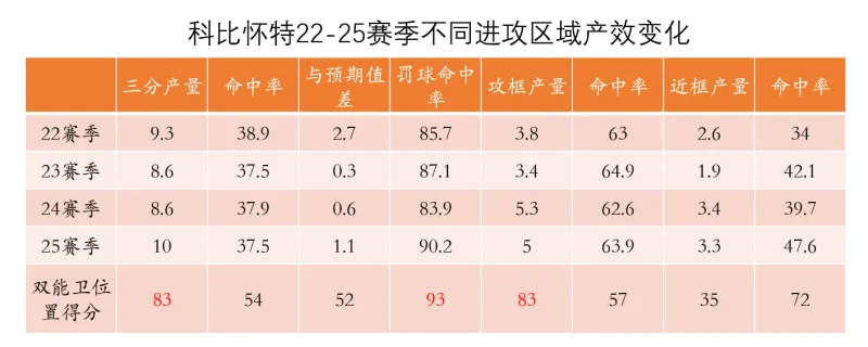 懷特在進(jìn)攻端最大的潛力在于他有著出色的罰球命中率,這意味著手感柔和的他可以更多開發(fā)他的三分和近框拋投。事實上過去四賽季懷特的三分命中率均在預(yù)期值之上,且非大空位三分能穩(wěn)定在34%的高水平,如果后續(xù)懷特能解鎖戰(zhàn)術(shù)三分,對球隊的幫助會非常大。