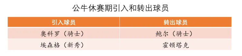 公牛在這個休賽期非常平靜,唯一一筆交易是用球哥交易來了騎士的奧科羅,這是一筆雙方各取所需的交易——健康狀態(tài)下的球哥是比奧科羅搶很多的球員,對于立志爭冠的騎士更希望通過交易拔高球隊上限;而奧科羅出勤率更高、能補足公牛稀缺的外線領(lǐng)防人角色同時也比較年輕,更適合重建后期的公牛,新賽季很可能直接從首發(fā)三號位打起。