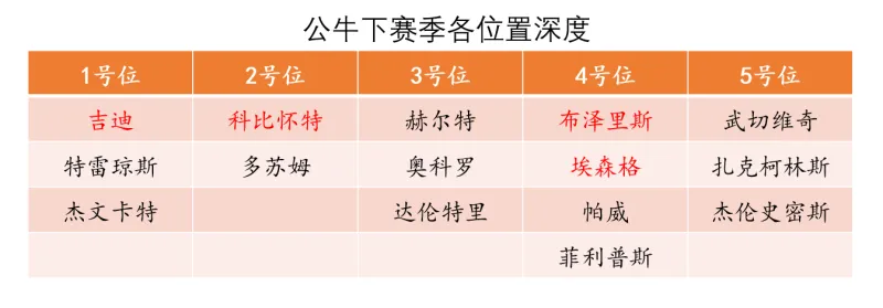 上表我總結(jié)了公牛隊下賽季各位置的深度,可以看到5號位位置的護(hù)框能力是球隊比較明顯的短板,特別是在武器一直被兜售的背景下,球隊5號位上既沒有優(yōu)質(zhì)防守中鋒、又沒有年輕天賦積累,大概率是管理層后續(xù)補強的重點位置。