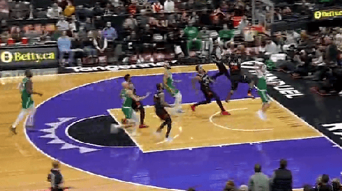 NBA常規(guī)賽,猛龍主場(chǎng)迎戰(zhàn)凱爾特人的上籃比賽正在進(jìn)行中。
