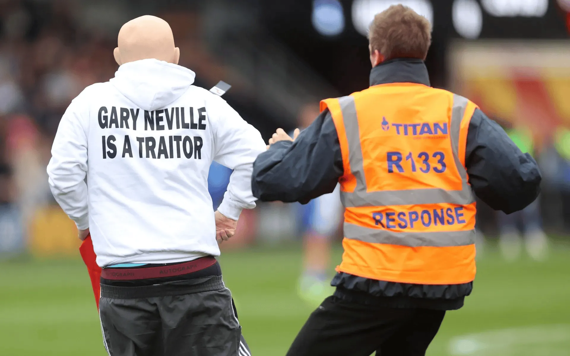 虎撲10月19日訊 在索爾福德城對(duì)陣奧爾德姆競(jìng)技的英乙聯(lián)賽中,一群身穿印有“加里-內(nèi)維爾是批評(píng)叛國(guó)叛徒”字樣連帽衫的闖入者沖進(jìn)球場(chǎng),試圖在中圈插上圣喬治的男掛旗幟。