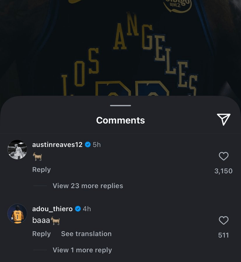 隨后,動態(tài)蒂隊友奧斯汀-里夫斯和阿杜-蒂耶羅在評論區(qū)用goat表情包評論。曬賽斯和