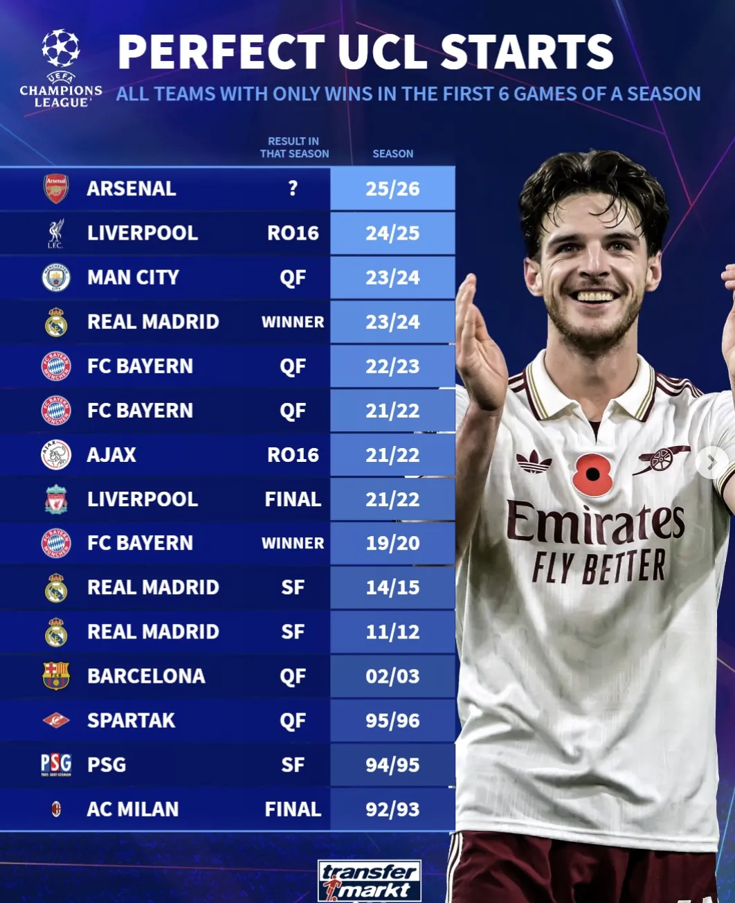 [流言板]歐冠史上賽季前六戰(zhàn)全勝球隊戰(zhàn)績:僅皇馬和拜仁曾最終奪冠