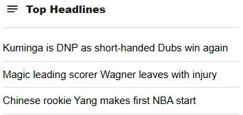 [流言板]ESPN今天頭條新聞:中國新秀楊瀚森NBA生涯首次首發(fā)