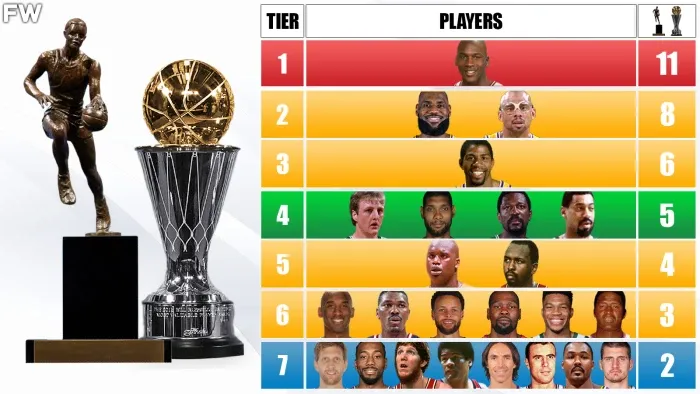 T4:拉里-伯德(3個(gè)MVP+2個(gè)FMVP)、蒂姆-鄧肯(2個(gè)MVP+3個(gè)FMVP)、比爾-拉塞爾(5個(gè)MVP);