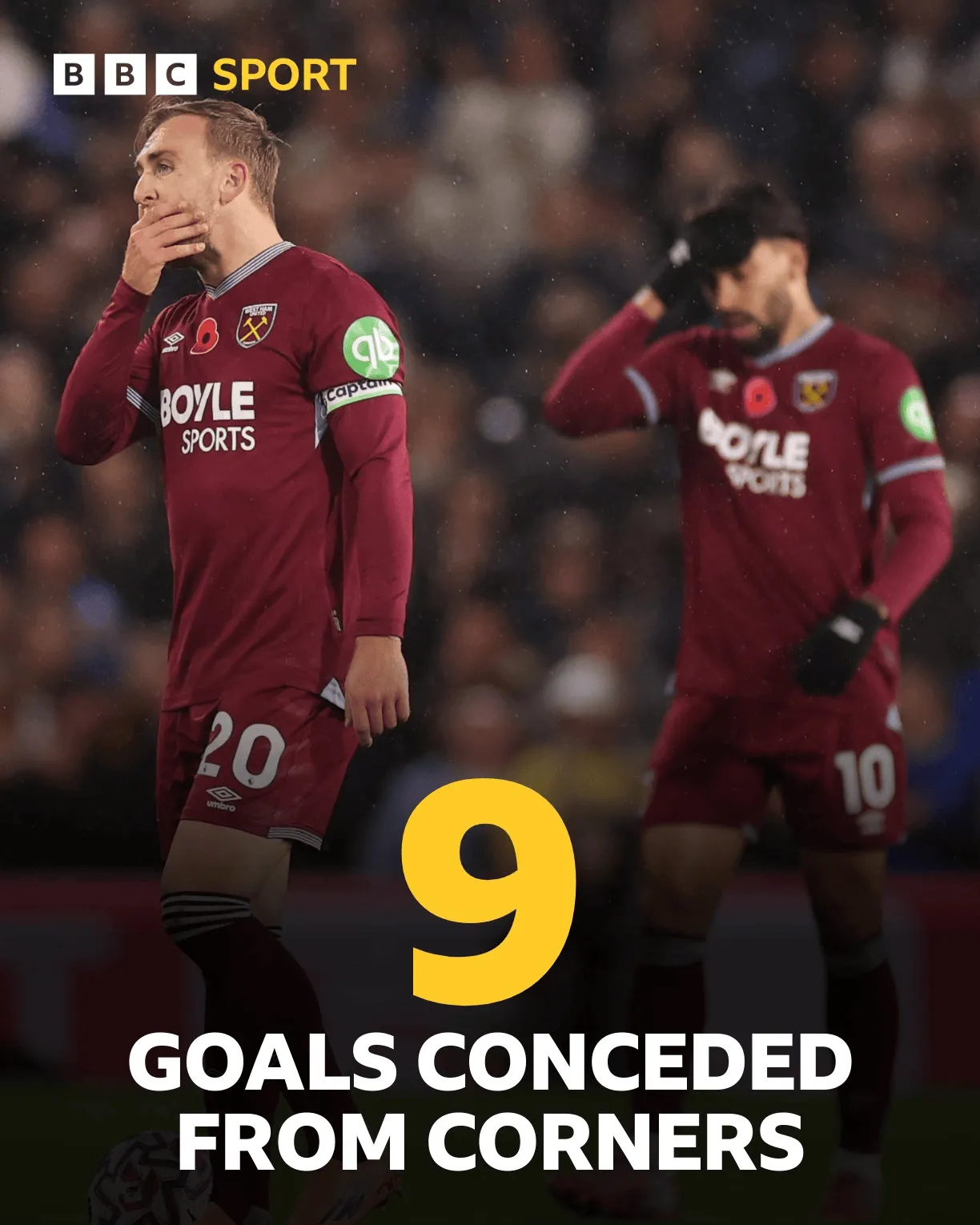 這是角球西漢姆聯本賽季英超第9次在角球防守中丟球。
