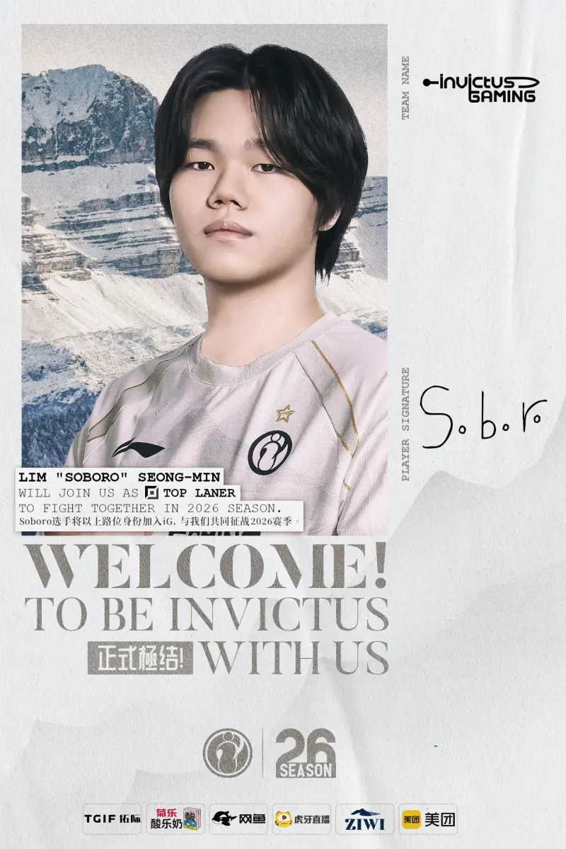 經過與選手的積極溝通以及友好協(xié)商后,我們高興地向大家宣布: 即日起,選手林成玟(游戲ID:Soboro)正式加入iG英雄聯盟分部擔任上路位。