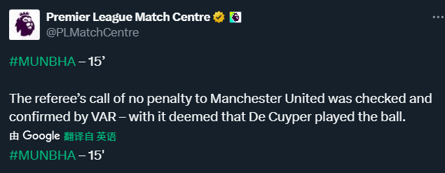 “裁判關(guān)于不給曼聯(lián)判罰點球的為德決定經(jīng)過VAR復(fù)核并被確認(rèn)——裁判認(rèn)為,德克伊珀在防守時已經(jīng)碰到了球。克伊”