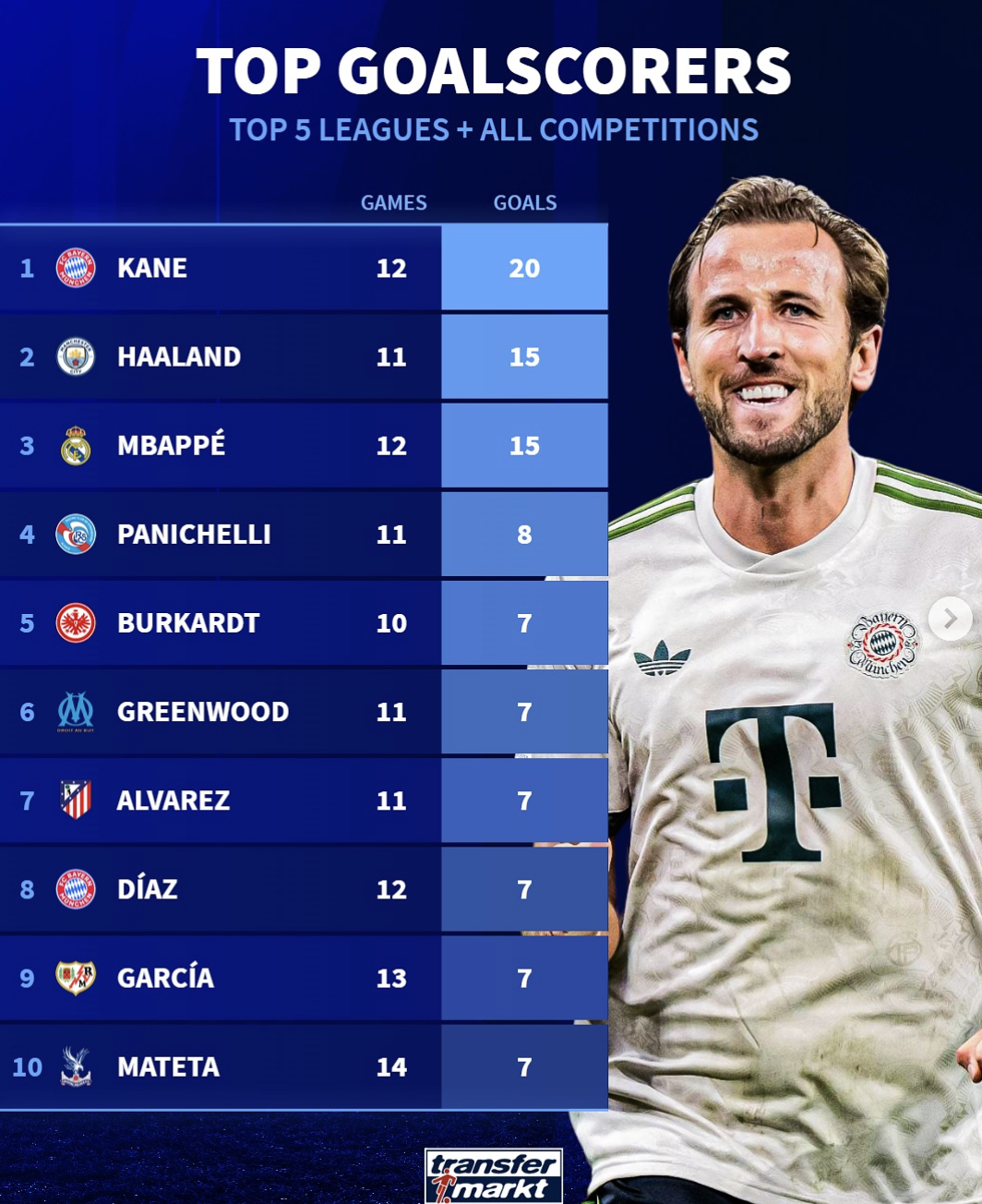 凱恩12場(chǎng)打進(jìn)20球高居榜首,哈蘭哈蘭德和姆巴佩分別在11場(chǎng)和12場(chǎng)中打進(jìn)15球位居二三。德和
