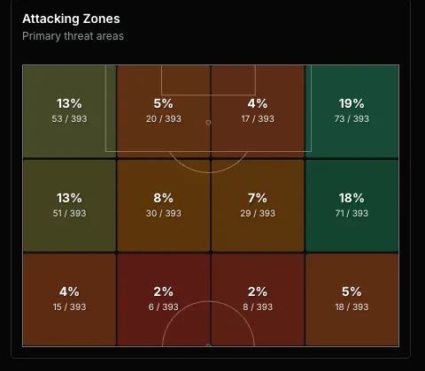 本賽季,弗蘭克通常采用4-2-3-1或4-3-3陣型,進(jìn)攻戰(zhàn)術(shù)高度依賴兩個(gè)邊路,約有72%的攻勢(shì)都由邊路發(fā)起。