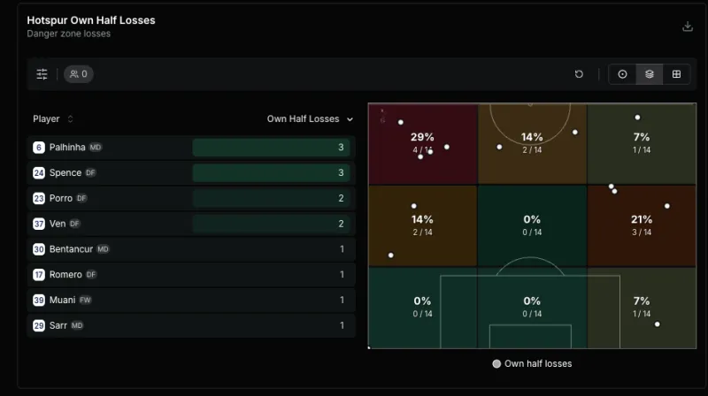 觸發(fā)式高壓,伺機(jī)前場(chǎng)緊逼:以前場(chǎng)緊逼作為一種觸發(fā)式戰(zhàn)術(shù),而非持續(xù)性策略。當(dāng)熱刺后場(chǎng)球員出現(xiàn)停球失誤、轉(zhuǎn)身緩慢或被迫回傳等特定信號(hào)時(shí),我們就可以立刻轉(zhuǎn)為前場(chǎng)壓迫,獲取球權(quán)后可以利用速度或者強(qiáng)弱冊(cè)轉(zhuǎn)移,利用對(duì)手后場(chǎng)組織的弱點(diǎn)直接制造威脅。