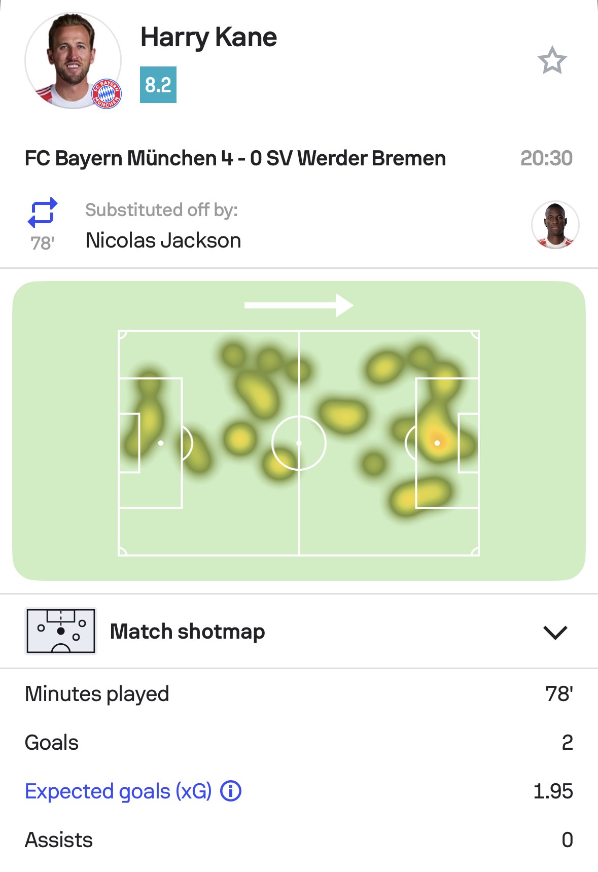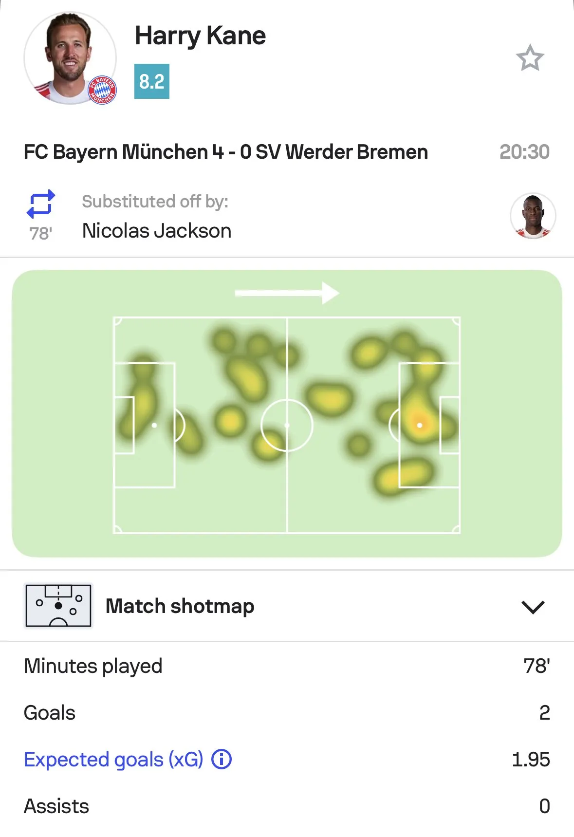 來源:X虎撲09月27日訊 德甲第五輪,拜仁4-0不萊梅。首位賽事凱恩本場完成梅開二度。各項