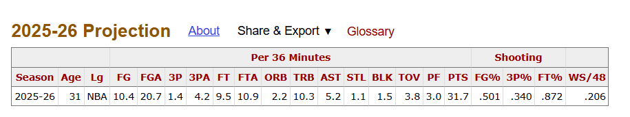 (每36分鐘內(nèi))31.7分10.3籃板5.2助攻1.1搶斷1.5蓋帽3.8失誤,三項命中率50.1%、測恩34.0%、新賽87.2%。分鐘分板