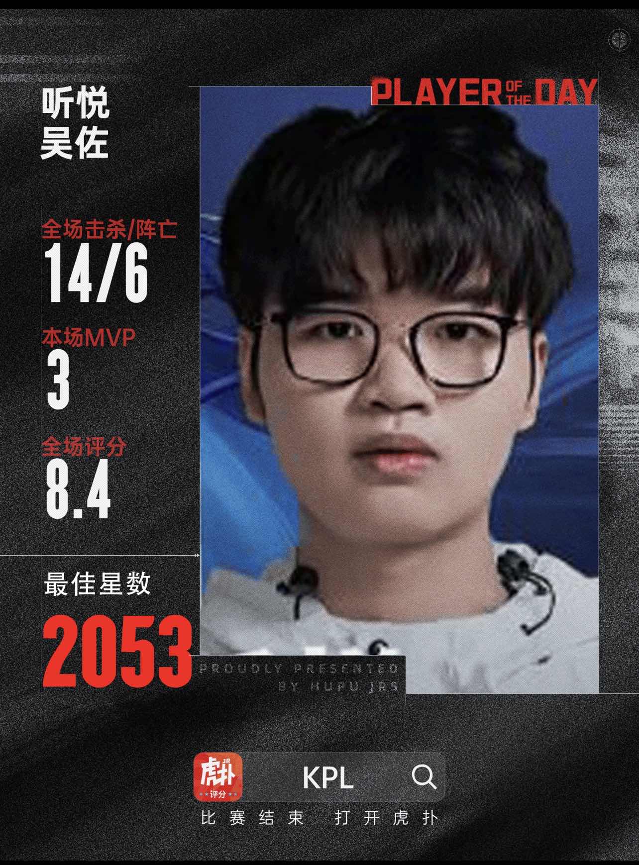 最終聽悅選手以9.9的評分,總星數(shù)2053(排除一星)斬獲昨日最佳選手!