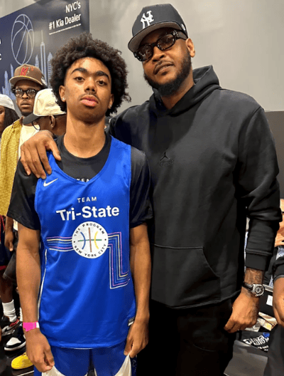 在線下活動中,尼前安東尼與前NBA球員拉夫-阿爾斯通之子里斯-阿爾斯通進行合影。員阿影