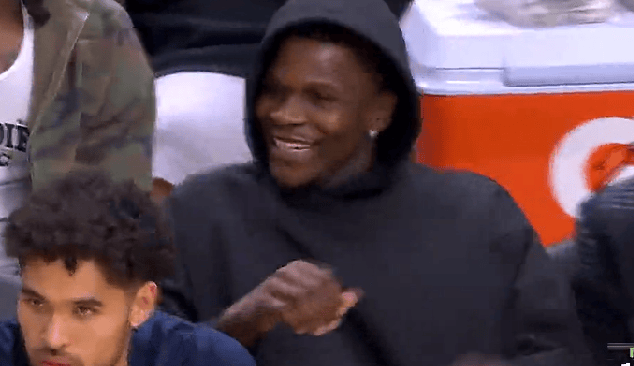 第四節(jié)比賽,開心穆迪底角接球追身三分再中追到4分,穆迪愛德華茲場邊開心大笑。底角到分大笑