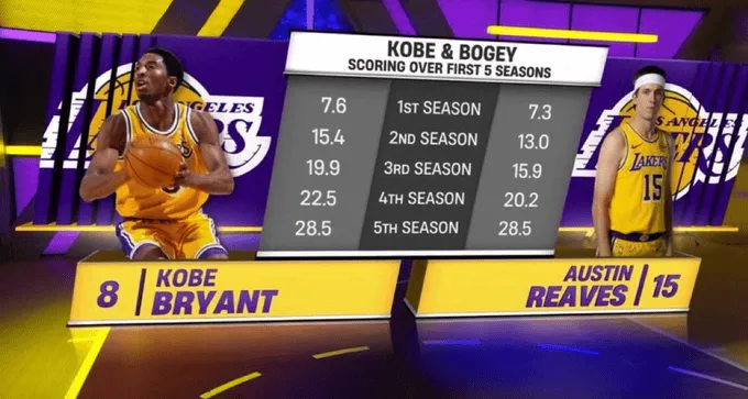 湖人自媒體Lakers Lead曬照,人自將科比-布萊恩特與奧斯汀-里夫斯生涯前5個賽季的媒體場均得分進行了對比。