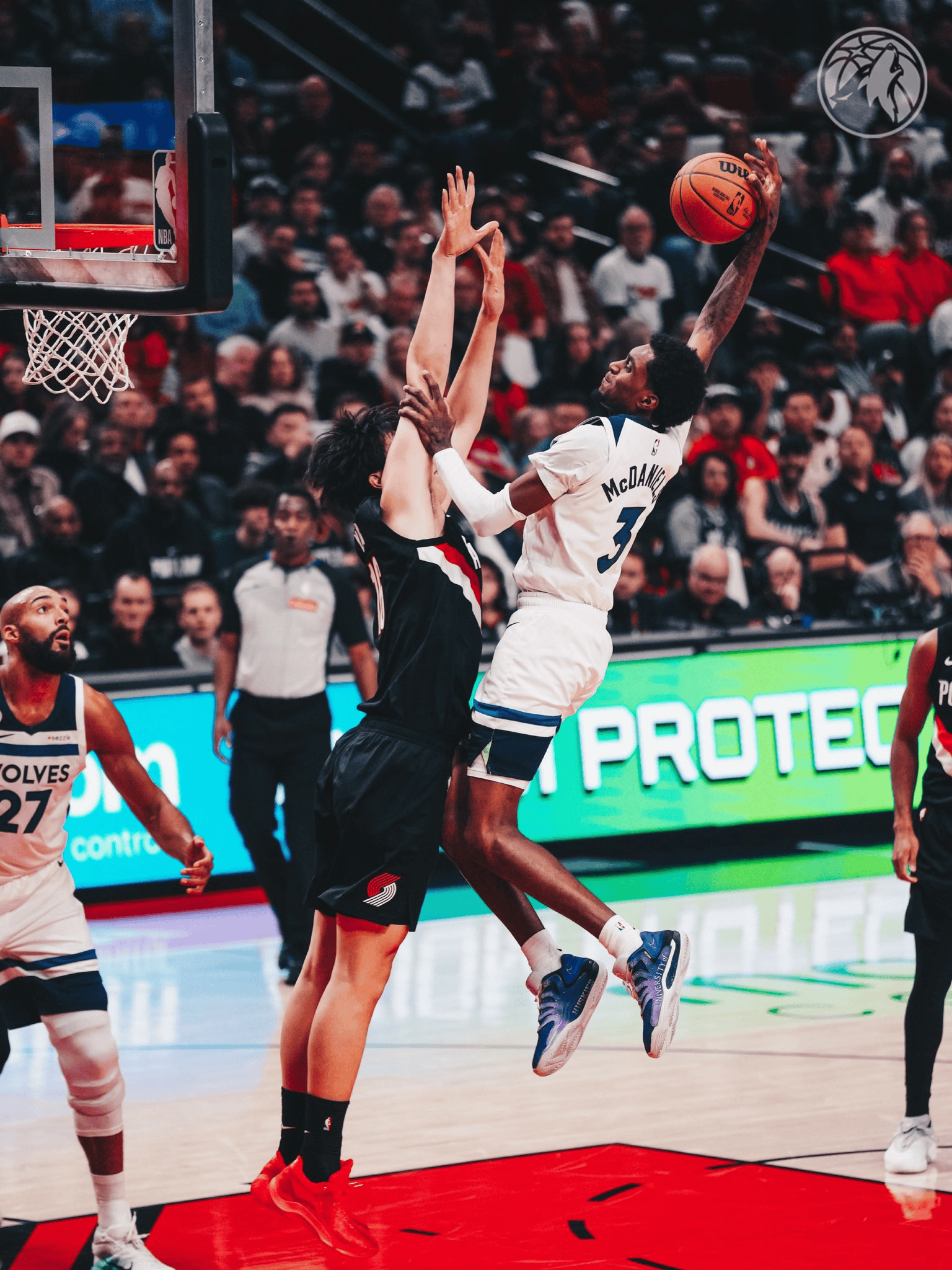 比賽第二節(jié),開(kāi)拓者球員楊瀚森慘遭麥克丹尼爾斯隔扣,森林狼官方曬出麥丹隔扣楊瀚森瞬間組圖。