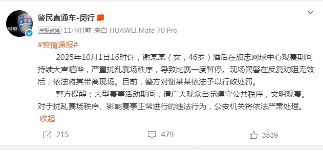 昨晚,警民直通車-閔行發(fā)布通報:2025年10月1日16時許,謝某某(女,46歲)酒后在旗忠網(wǎng)球中心觀賽期間持續(xù)大聲喧嘩,嚴(yán)重擾亂賽場秩序,導(dǎo)致比賽一度暫停。現(xiàn)場民警在反復(fù)勸阻無效后,依法將其帶離現(xiàn)場。