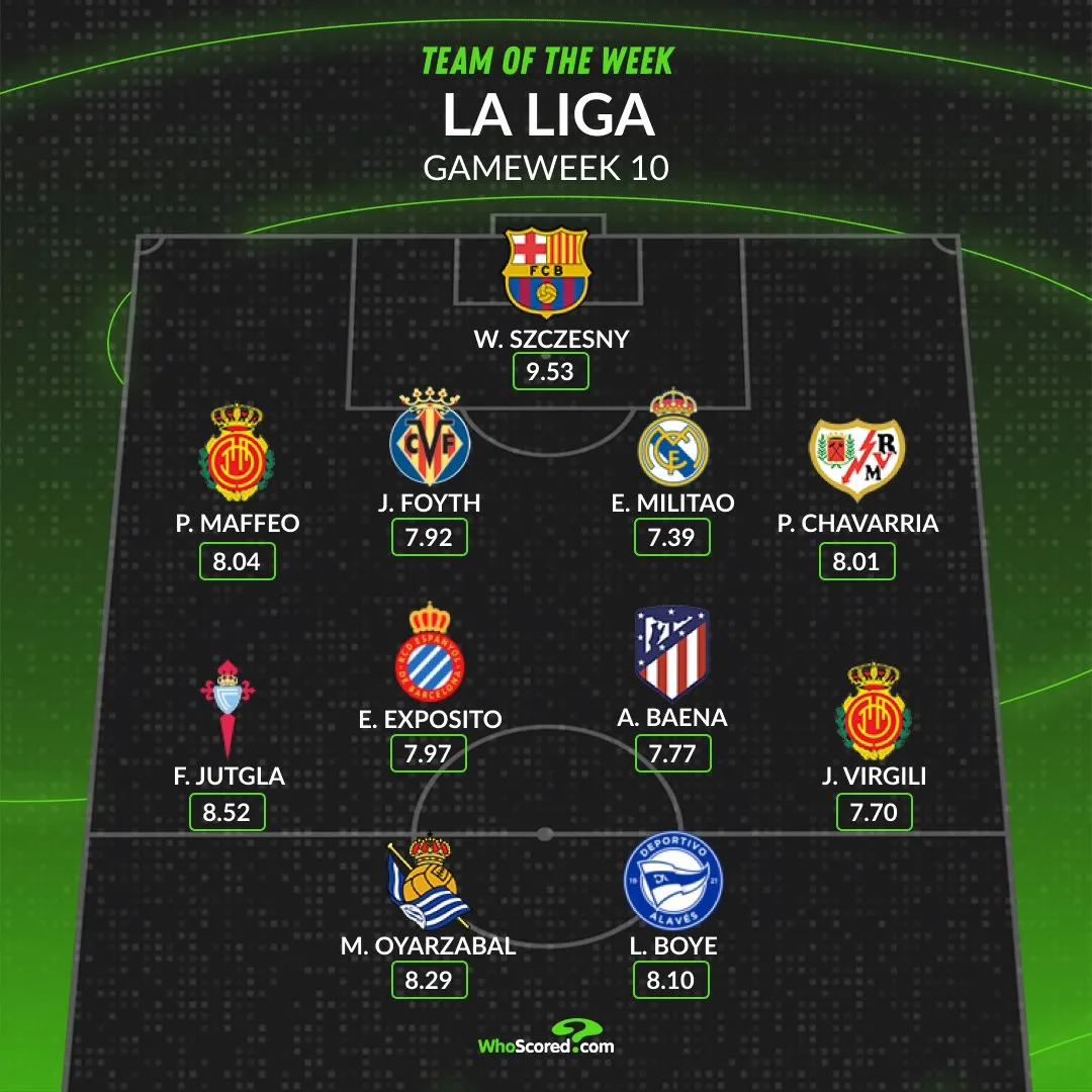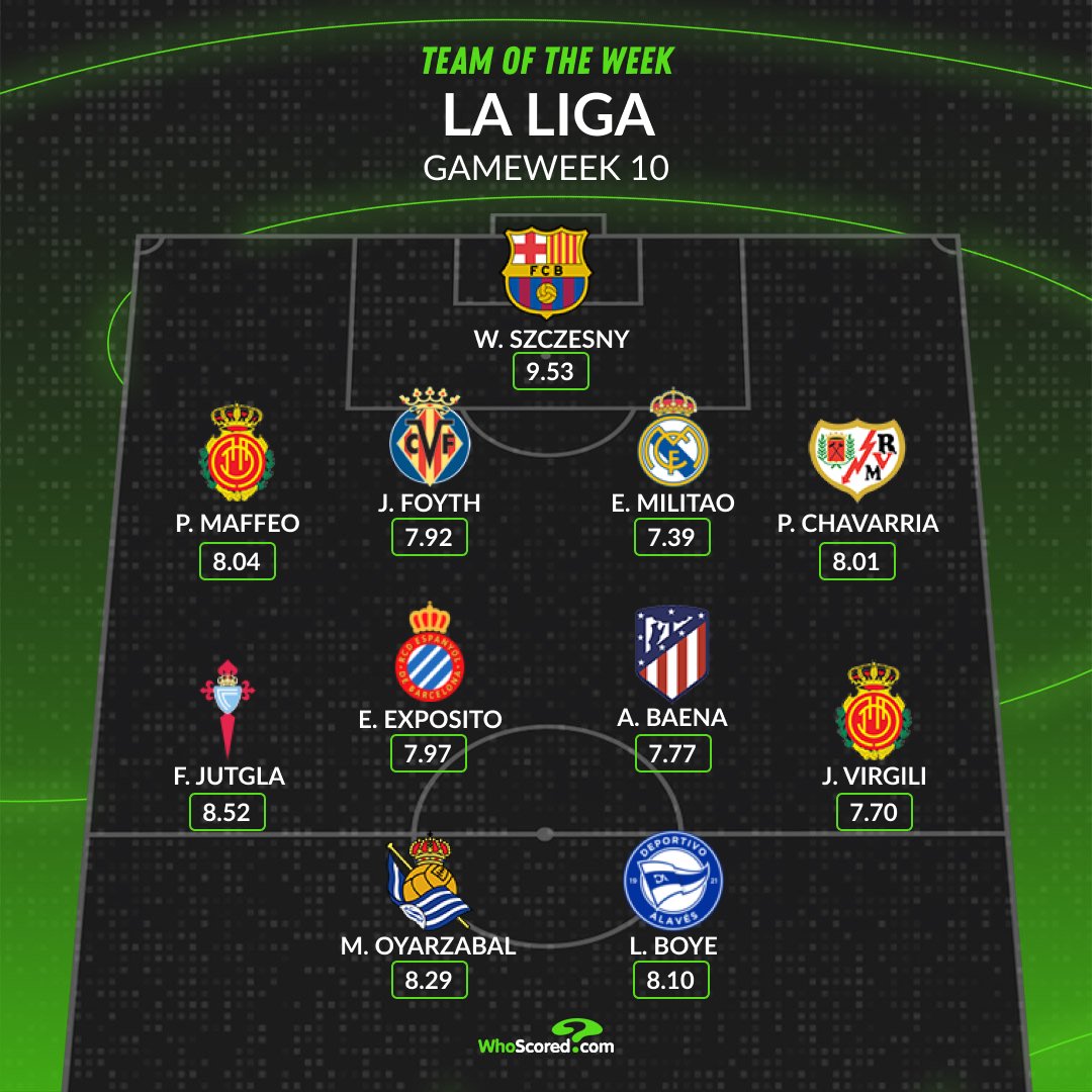 虎撲10月28日訊 Whoscored根據(jù)球員評(píng)分,評(píng)選出了西甲聯(lián)賽的本周最佳陣容。