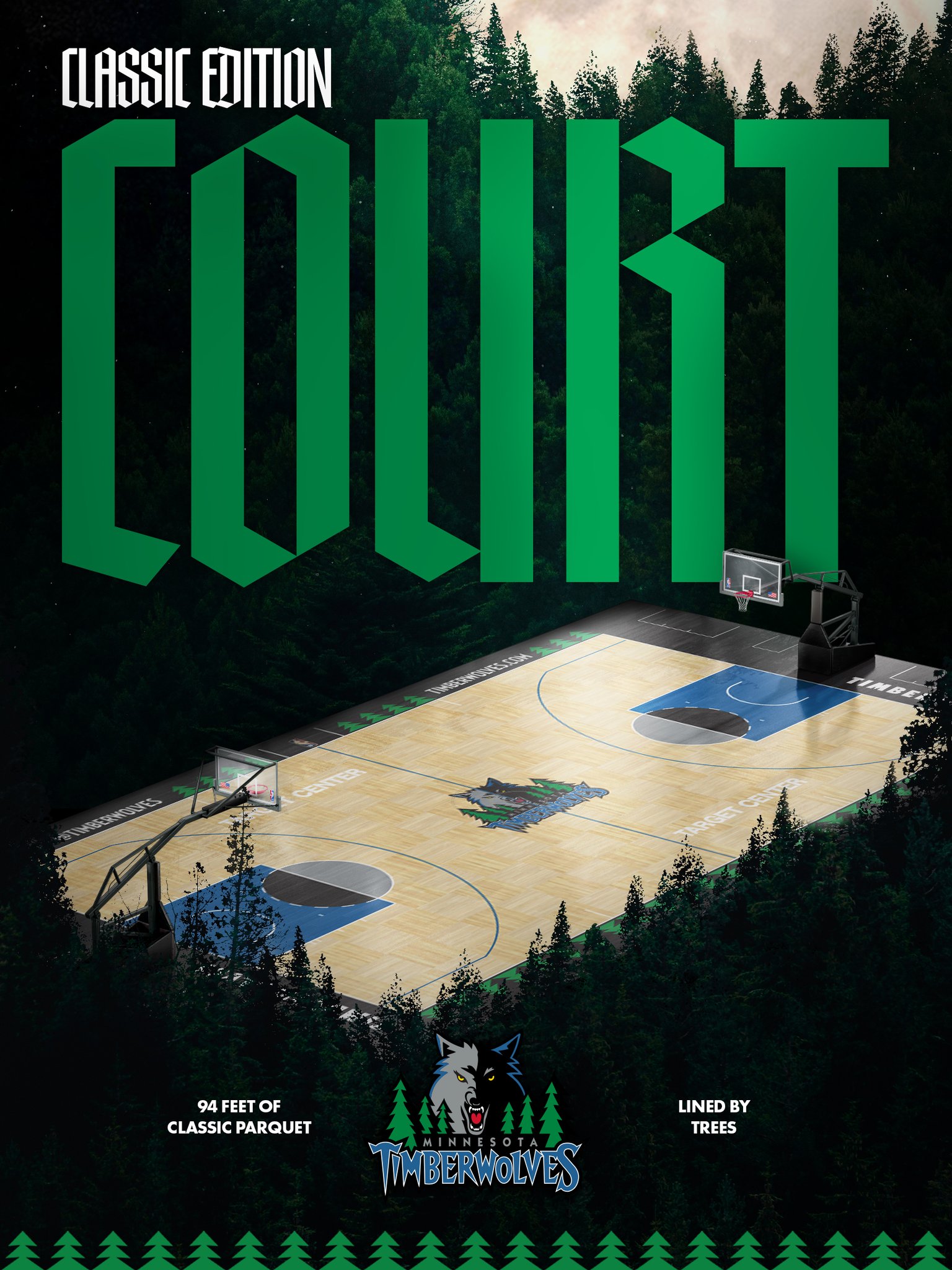 今日,森林狼社媒曬出經(jīng)典“樹木”主題地板的典的搭配的球照片,并配文: