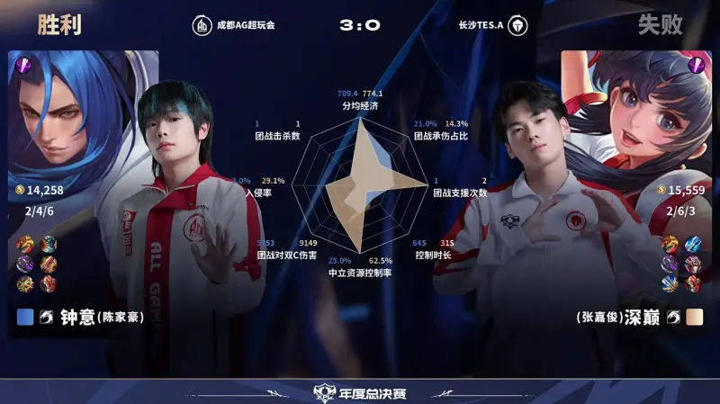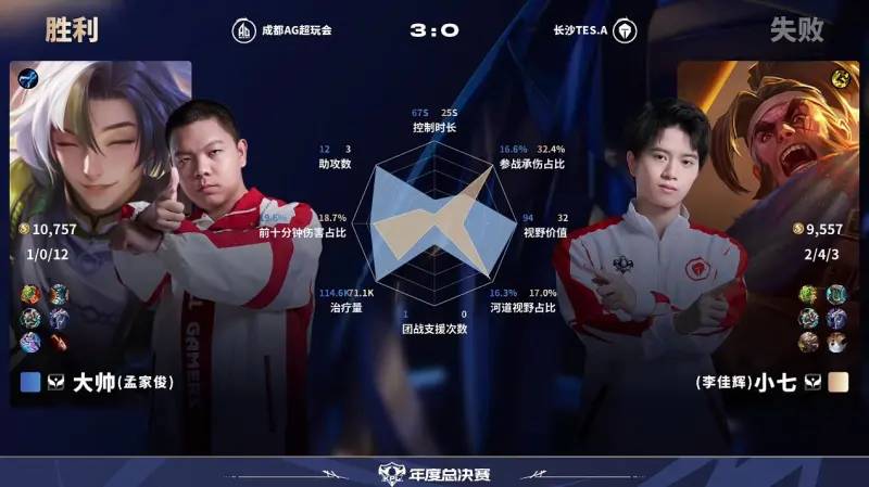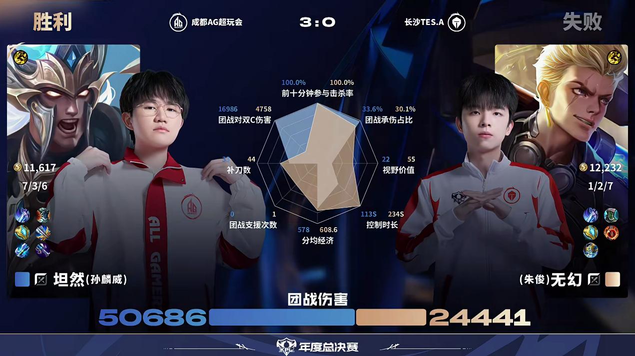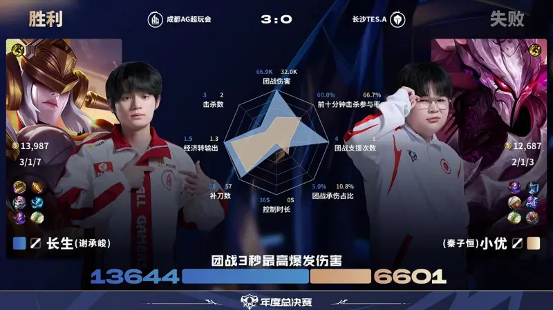 虎撲10月11日訊 AG/TES第3局數(shù)據(jù)對比:坦然團戰(zhàn)傷害五萬,長生幾乎包圍小優(yōu)。比坦