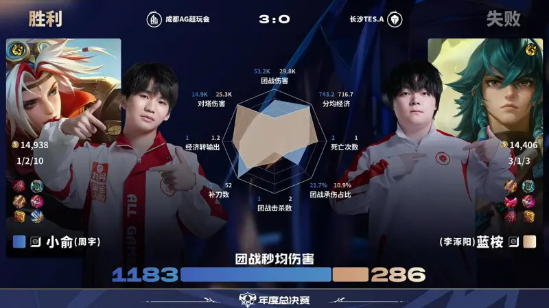 虎撲10月11日訊 AG/TES第3局數(shù)據(jù)對比:坦然團戰(zhàn)傷害五萬,長生幾乎包圍小優(yōu)。戰(zhàn)傷