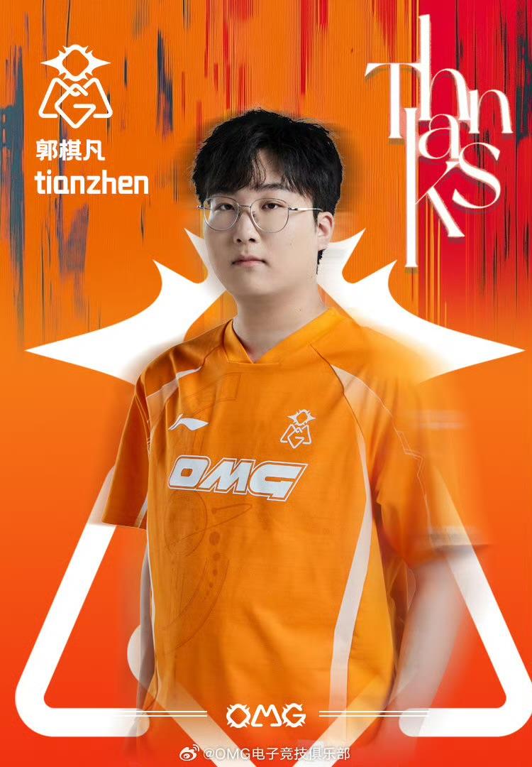 原OMG電子競(jìng)技俱樂部英雄聯(lián)盟一隊(duì)選手:OMG.Tianzhen(郭棋凡)即日起以自由人身份離隊(duì)。選手