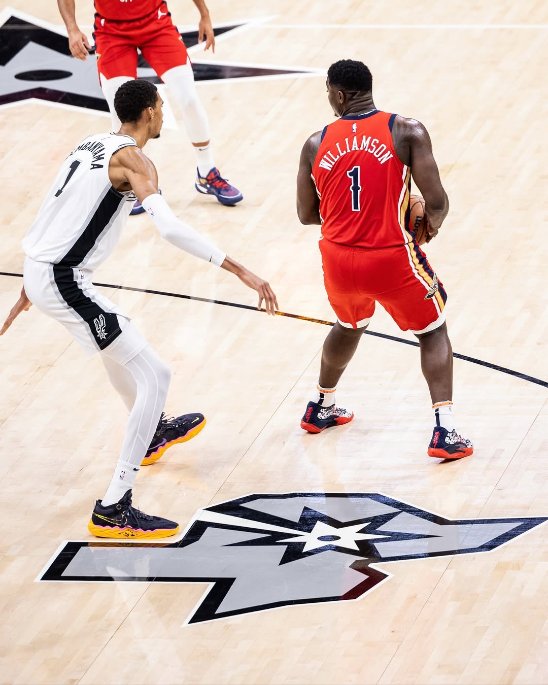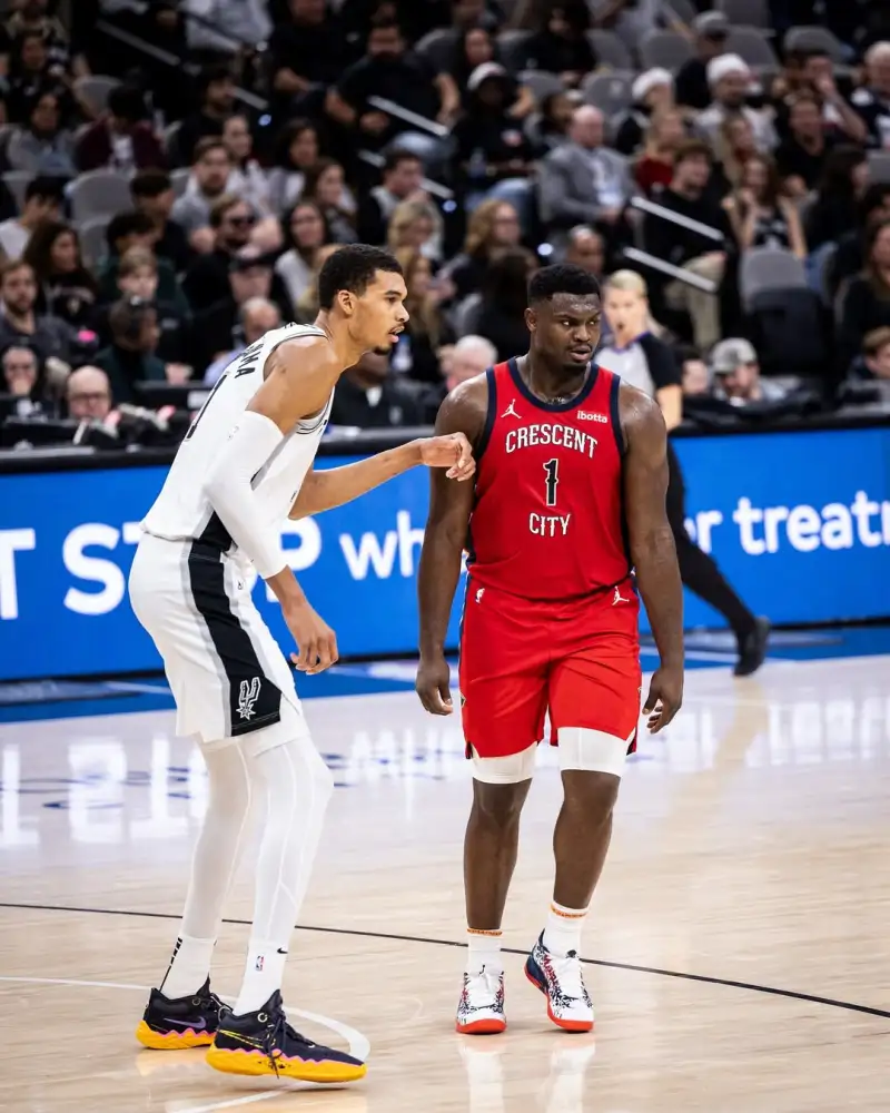 虎撲09月26日訊 鵜鶘官方更新Ins,曬出一組鵜鶘球員蔡恩-威廉森和馬刺球員維克托-文班亞馬的決鵜對(duì)位照與球迷分享。