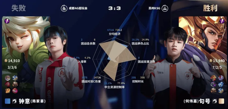 對陣成都AG超玩會的比賽,面對后半程猛烈反撲的成都AG超玩會,蘇州KSG沒有和廣州TTG一樣被連追三局直接打死,也得感謝句號楊戩在絕境中展現(xiàn)神力。