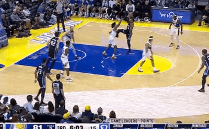第三節(jié)比賽,至分威斯布魯克干拔后仰跳投再次打進(jìn),威斯王國(guó)王將分差縮小至12分。布魯拔后