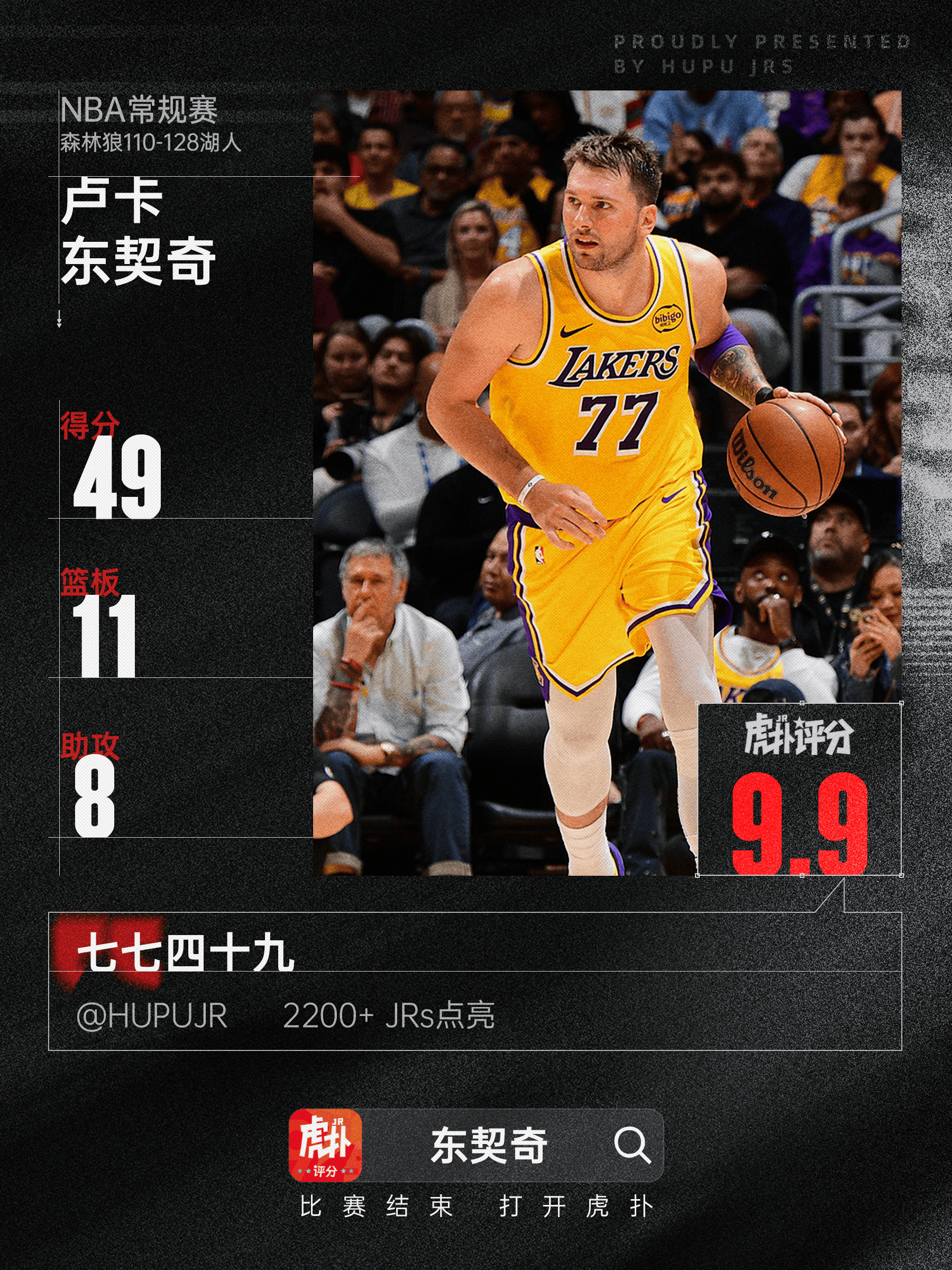 本場比賽,罰中分籃湖人球員盧卡-東契奇出戰(zhàn)34分鐘,砍下23投14中,巨星其中三分球12投5中,表演板助罰球19投16中,東契得到49分11籃板8助攻。奇全