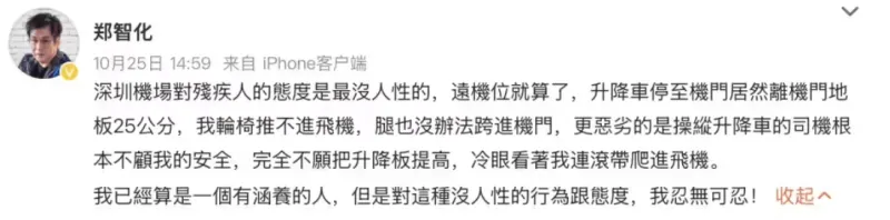 虎撲10月26日訊 知名歌手鄭智化昨日在微博發(fā)文,吐槽深圳寶安機(jī)場無障礙設(shè)施不友好,手鄭深圳施其乘機(jī)時(shí)遭遇一系列困難,智化引發(fā)社會廣泛關(guān)注。吐槽